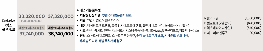 익스클루시브 트림은 3,832만 원(개별소비세 3.5% 적용 시 3,774만 원)으로, 외관에서 한 단계 업그레이드됩니다