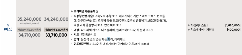 - S 트림: 3,524만 원으로 12.3인치 내비게이션, 고속도로 주행 보조, 통풍시트 등 편의 사양 대폭 강화. 외관은 프리미엄과 동일하므로 익스테리어 디자인 Ⅲ 추가 권장