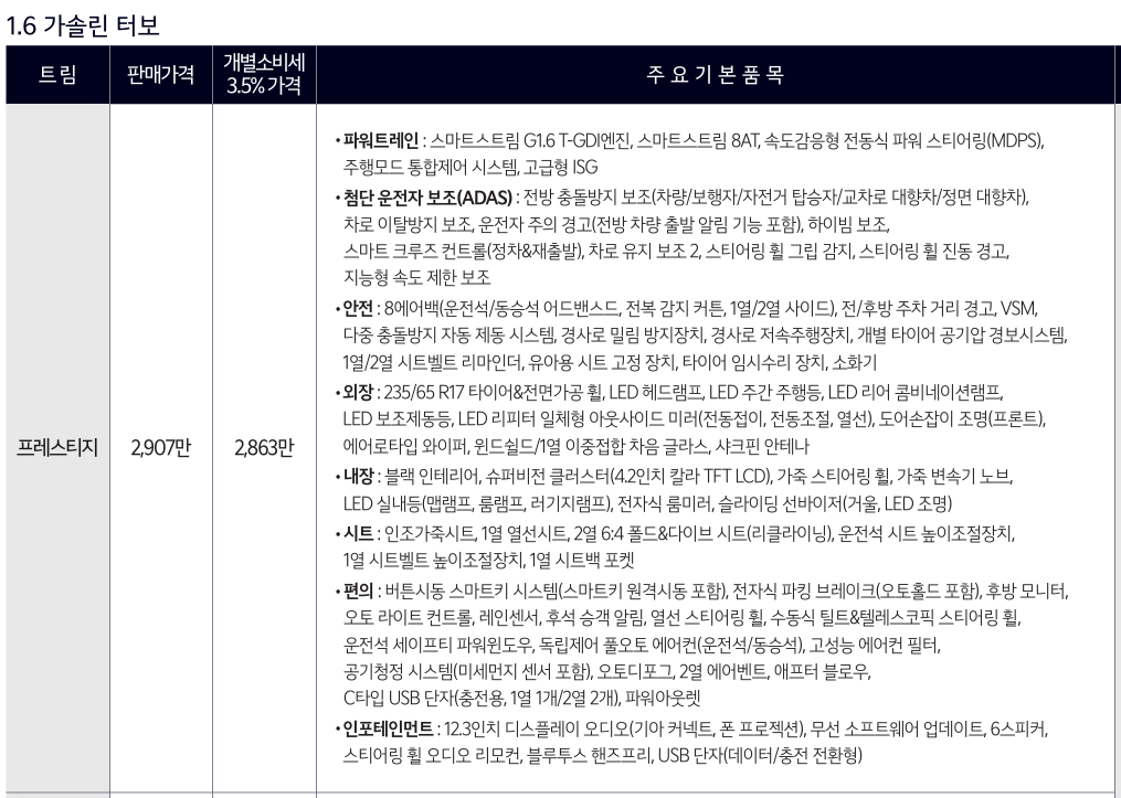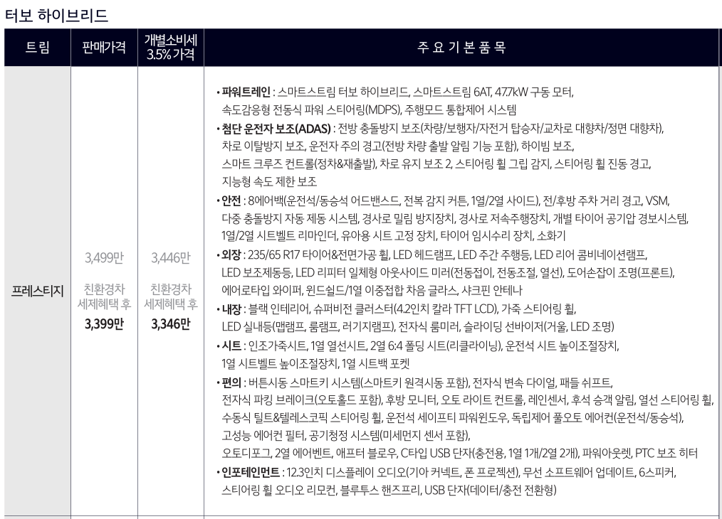 | 프레스티지 트림 | 2,863만 원 | 3,346만 원 | 483만 원 |