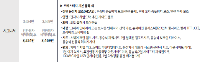 가솔린 1.6 터보 시그니처는 3,101만 원, 1.6 터보 하이브리드 시그니처는 3,469만 원으로, 트렌디·프레스티지보다 확실히 높은 가격대에 포지셔닝됩니다.