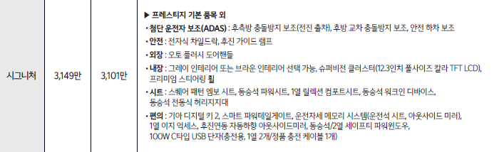 시그니처 트림을 선택하면 편의 기능에서도 별도 옵션을 선택하지 않아도 될 만큼 만족스러운 구성이 적용됩니다.